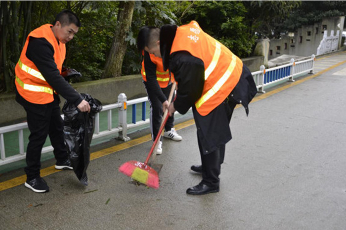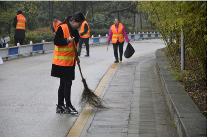 到達(dá)公園,全體志愿者統(tǒng)一穿上“黃馬甲”,拿著垃圾袋、掃帚、鏟子等勞動(dòng)工具,按照區(qū)域分工積極行動(dòng)。雖然下雨有些不便,但志愿者們工作熱情不減,態(tài)度毫不懈怠。