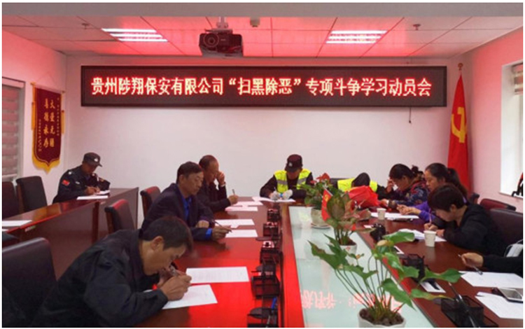 2019 年 4 月 8 日,貴州陟翔保安有限公司召集各區(qū)域經(jīng)理、項目經(jīng)理、項目隊長在公司會議室召開了“掃黑除惡” 專項斗爭學(xué)習(xí)動員大會。會議由公司總經(jīng)理陳春生主持,會上傳達學(xué)習(xí)了貴陽市公安局治安支隊保安服務(wù)管理大隊下發(fā)的《關(guān)于保安服務(wù)行業(yè)積極協(xié)助公安機關(guān)開展掃黑除惡專項斗爭和加強隊伍建設(shè)工作的通知》及《掃黑除惡應(yīng)知應(yīng)會》 知識,并就貫徹落實《通知》精神作周密的部署:一是要確實學(xué)懂弄通掃黑除惡專項斗爭的重大意義,從思想上高度重視;二是熟悉《掃黑除惡應(yīng)知應(yīng)會》知識,從行動上積極主動配合公安機關(guān)行動;三是認(rèn)真仔細開展排查清理保安員隊伍,對不適宜從事保安工作的人員迅速作清退處理,保持隊伍的純潔性;四是要將《通知》精神傳達到每個隊員,密切關(guān)注在職隊員的現(xiàn)實表現(xiàn),進行動態(tài)管理,加強思想教育,及時制止不良苗頭;五是要規(guī)范隊員入職政審工作,嚴(yán)格按《保安服務(wù)管理條例》規(guī)定辦理入職手續(xù)。