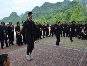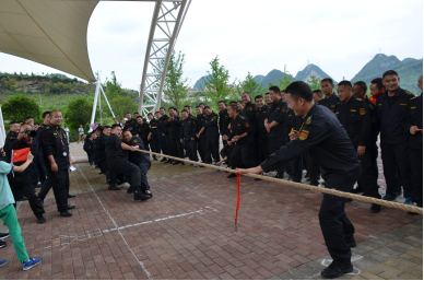 二、此次活動邀請了監(jiān)管機(jī)關(guān)及客戶單位共17家到場觀摩指導(dǎo)。分公司經(jīng)理黃水波向蒞臨的各級領(lǐng)導(dǎo)和來賓致歡迎詞,對他們的到來表示熱烈的歡迎和由衷感謝。室外科目為跳繩、接力賽、拔河三個項目。跳繩每隊為3名隊員,記集體總成績,各大、中隊精心挑選出各自跳繩尖子,積極為參賽人員吶喊、助威,一個個參賽的帥小伙瞬間變成了蹦蹦跳跳的“小女生”。接力賽為6乘50米,各中隊長抽選運動健將,為著各自的榮譽(yù)和不服輸勁頭在賽場上拼命沖刺。最激烈的當(dāng)數(shù)拔河比賽了,各參隊每隊為10人,分為淘汰賽、半決賽和決賽,各大、中都將“大塊頭”、“大胖墩”推上賽場,隨著裁判員的一聲哨音,現(xiàn)場仿佛炸開了鍋,在旁觀加油鼓勁的人員似乎比拔河人員更賣力,邀請到的客戶單位領(lǐng)導(dǎo)也都在為各自派駐中隊參賽隊員加油,活動氛圍瞬時達(dá)到頂峰。