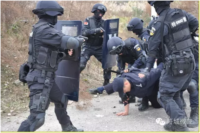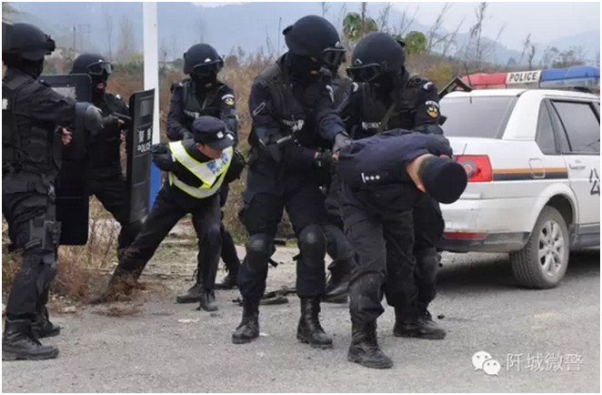 在演練現(xiàn)場,2名喬裝成警察的“歹徒”在通往一鄉(xiāng)鎮(zhèn)的公路上設(shè)卡,借口例行檢查,持槍對一輛有“鎮(zhèn)東護運”字樣的運鈔車實施“搶劫”,在與押運人員交談中,不料卻被押運人員識破其“詭計”,2名“歹徒”原形畢露,立即開槍射擊,就在這一瞬間,押運人員依法開槍將其中一名“歹徒”“擊傷”并迅速駕車至安全區(qū)域。同時,電話向警方報警求助。隨后,警方快速集結(jié)特警、巡警等30余名警力前往處置,通過喊話和政策攻心,2名“歹徒”仍然負(fù)隅頑抗,并向特警開槍。在勸說無效的情況下,指揮員下達對持槍“歹徒”采取強制措施的命令。歷時8分鐘,特警成功將2名“歹徒”制服并抓獲,隨即在醫(yī)護人員的幫助下,將“受傷”“歹徒”抬上救護車,送往醫(yī)院……